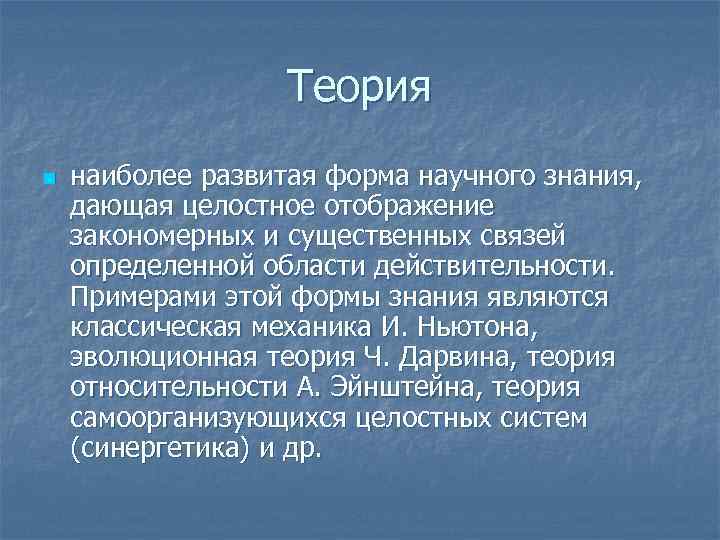 Теория n наиболее развитая форма научного знания, дающая целостное отображение закономерных и существенных связей определенной области действительности. Примерами этой формы знания являются классическая механика И. Ньютона, эволюционная теория Ч. Дарвина, теория относительности А. Эйнштейна, теория самоорганизующихся целостных систем (синергетика) и др.