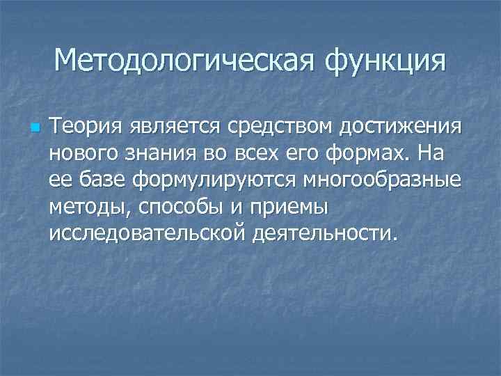 Методологическая функция n Теория является средством достижения нового знания во всех его формах. На ее базе формулируются многообразные методы, способы и приемы исследовательской деятельности.