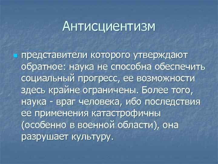 Антисциентизм n представители которого утверждают обратное: наука не способна обеспечить социальный прогресс, ее возможности здесь крайне ограничены. Более того, наука - враг человека, ибо последствия ее применения катастрофичны (особенно в военной области), она разрушает культуру.
