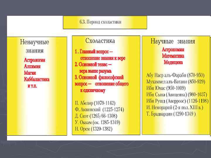 СХОЛАСТИКА ► Систематическая средневековая философия, сконцентрированная вокруг университетов и представляющая собой синтез христианского (католического) богословия и логики Аристотеля.