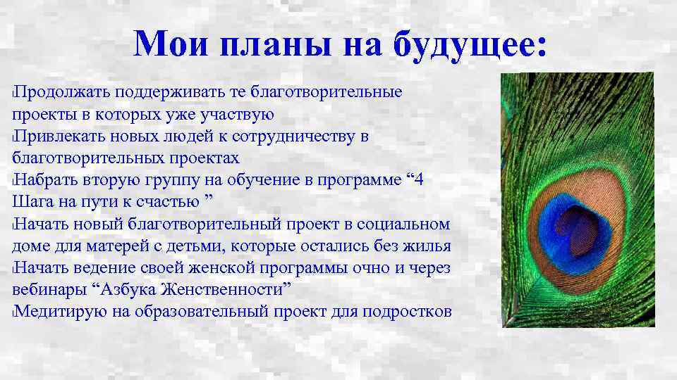 Мои планы на будущее: Продолжать поддерживать те благотворительные проекты в которых уже участвую l. Привлекать новых людей к сотрудничеству в благотворительных проектах l. Набрать вторую группу на обучение в программе “ 4 Шага на пути к счастью ” l. Начать новый благотворительный проект в социальном доме для матерей с детьми, которые остались без жилья l. Начать ведение своей женской программы очно и через вебинары “Азбука Женственности” l. Медитирую на образовательный проект для подростков l
