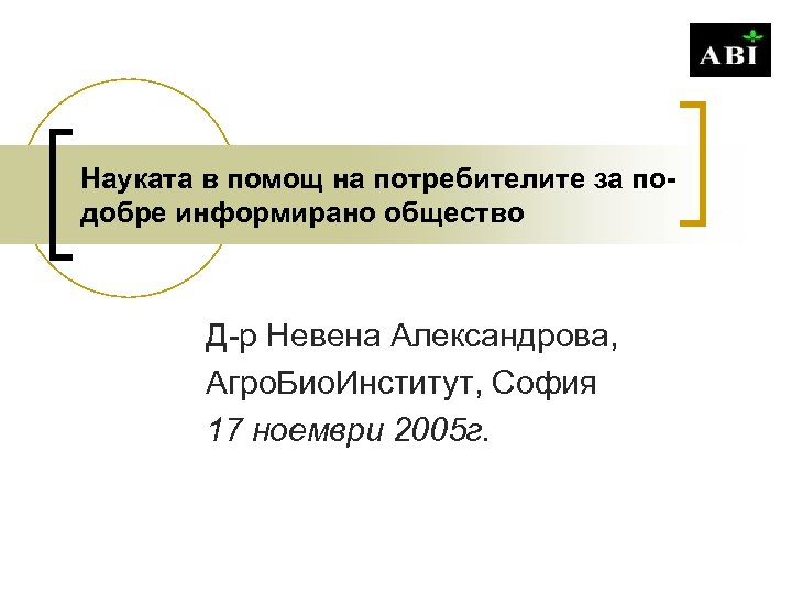 Науката в помощ на потребителите за подобре информирано общество Д-р Невена Александрова, Агро. Био. Институт, София 17 ноември 2005 г.