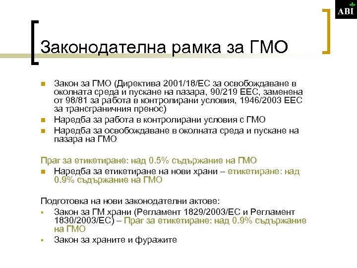 Законодателна рамка за ГМО n n n Закон за ГМО (Директива 2001/18/EC за освобождаване в околната среда и пускане на пазара, 90/219 EEC, заменена от 98/81 за работа в контролирани условия, 1946/2003 EEC за трансграничния пренос) Наредба за работа в контролирани условия с ГМО Наредба за освобождаване в околната среда и пускане на пазара на ГМО Праг за етикетиране: над 0. 5% съдържание на ГМО n Наредба за етикетиране на нови храни – етикетиране: над 0. 9% съдържание на ГМО Подготовка на нови законодателни актове: § Закон за ГМ храни (Регламент 1829/2003/EC и Регламент 1830/2003/EC) – Праг за етикетиране: над 0. 9% съдържание на ГМО § Закон за храните и фуражите