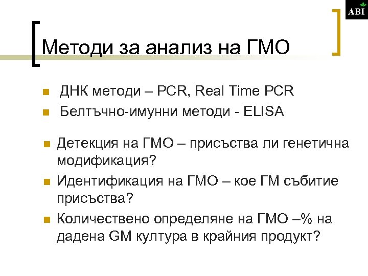 Методи за анализ на ГМО n n n ДНК методи – PCR, Real Time PCR Белтъчно-имунни методи - ELISA Детекция на ГМО – присъства ли генетична модификация? Идентификация на ГМО – кое ГМ събитие присъства? Количествено определяне на ГМО –% на дадена GM култура в крайния продукт?