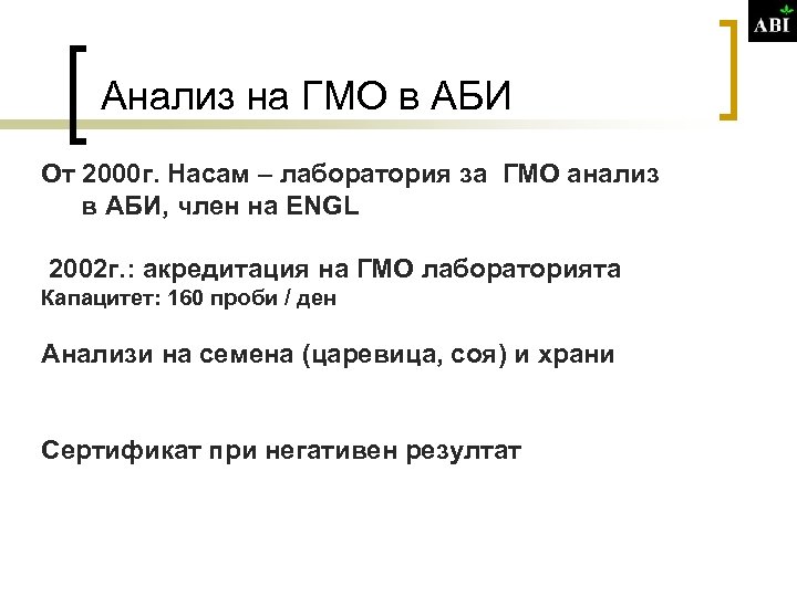 Анализ на ГМО в АБИ От 2000 г. Насам – лаборатория за ГМО анализ в АБИ, член на ENGL 2002 г. : акредитация на ГМО лабораторията Капацитет: 160 проби / ден Анализи на семена (царевица, соя) и храни Сертификат при негативен резултат