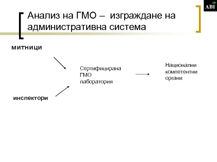 Анализ на ГМО – изграждане на административна система митници Сертифицирана ГМО лаборатория инспектори Национални компетентни органи