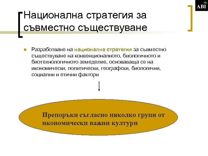 Национална стратегия за съвместно съществуване n Разработване на национална стратегия за съвместно съществуване на конвенционалното, биологичното и биотехнологичното земеделие, основаваща се на икономически, политически, географски, биологични, социални и етични фактори Препоръки съгласно няколко групи от икономически важни култури