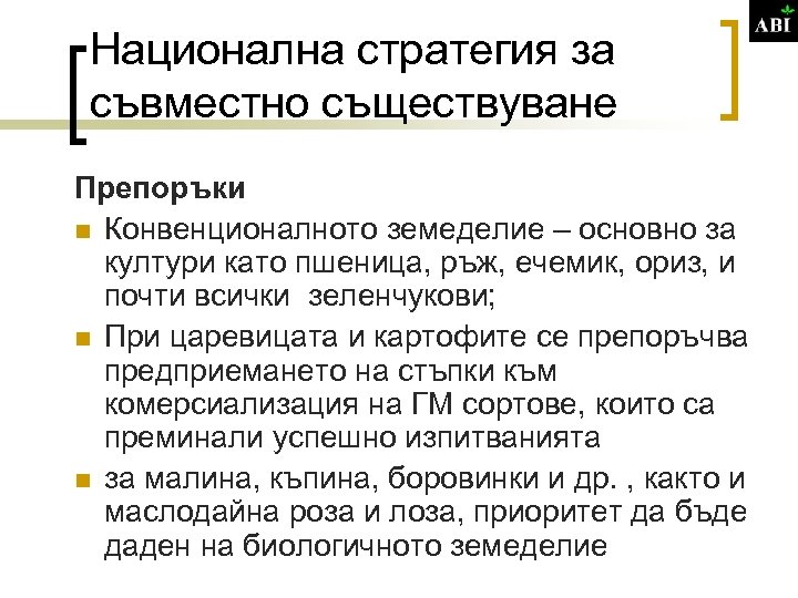 Национална стратегия за съвместно съществуване Препоръки n Конвенционалното земеделие – основно за култури като пшеница, ръж, ечемик, ориз, и почти всички зеленчукови; n При царевицата и картофите се препоръчва предприемането на стъпки към комерсиализация на ГМ сортове, които са преминали успешно изпитванията n за малина, къпина, боровинки и др. , както и маслодайна роза и лоза, приоритет да бъде даден на биологичното земеделие