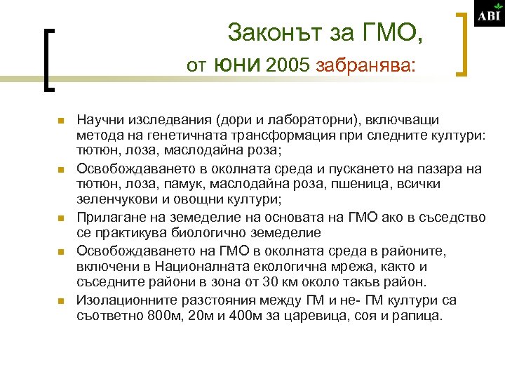 Законът за ГМО, от юни 2005 забранява: n n n Научни изследвания (дори и лабораторни), включващи метода на генетичната трансформация при следните култури: тютюн, лоза, маслодайна роза; Освобождаването в околната среда и пускането на пазара на тютюн, лоза, памук, маслодайна роза, пшеница, всички зеленчукови и овощни култури; Прилагане на земеделие на основата на ГМО ако в съседство се практикува биологично земеделие Освобождаването на ГМО в околната среда в районите, включени в Националната екологична мрежа, както и съседните райони в зона от 30 км около такъв район. Изолационните разстояния между ГМ и не- ГМ култури са съответно 800 м, 20 м и 400 м за царевица, соя и рапица.