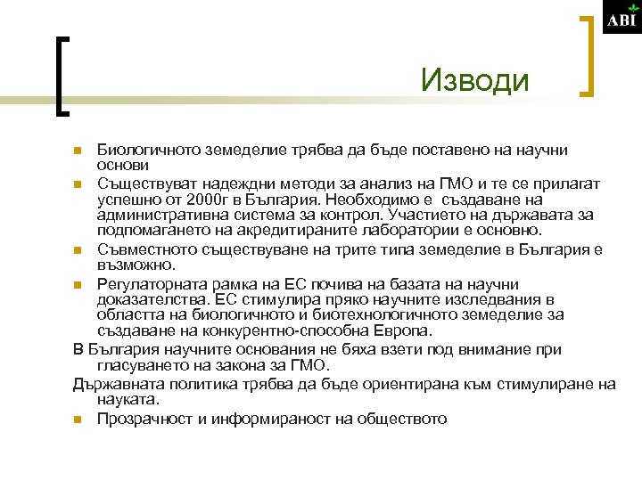 Изводи Биологичното земеделие трябва да бъде поставено на научни основи n Съществуват надеждни методи за анализ на ГМО и те се прилагат успешно от 2000 г в България. Необходимо е създаване на административна система за контрол. Участието на държавата за подпомагането на акредитираните лаборатории е основно. n Съвместното съществуване на трите типа земеделие в България е възможно. n Регулаторната рамка на ЕС почива на базата на научни доказателства. ЕС стимулира пряко научните изследвания в областта на биологичното и биотехнологичното земеделие за създаване на конкурентно-способна Европа. В България научните основания не бяха взети под внимание при гласуването на закона за ГМО. Държавната политика трябва да бъде ориентирана към стимулиране на науката. n Прозрачност и информираност на обществото n