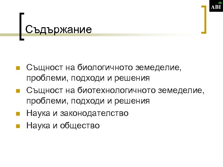 Съдържание n n Същност на биологичното земеделие, проблеми, подходи и решения Същност на биотехнологичното земеделие, проблеми, подходи и решения Наука и законодателство Наука и общество