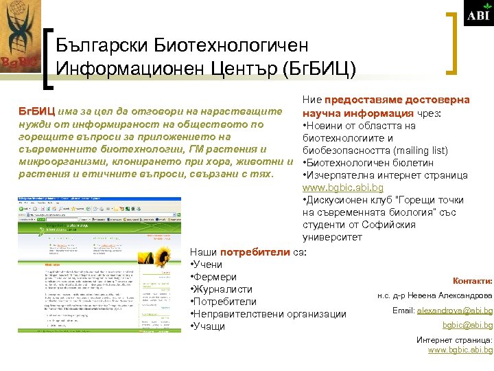 Български Биотехнологичен Информационен Център (Бг. БИЦ) Ние предоставяме достоверна Бг. БИЦ има за цел да отговори на нарастващите научна информация чрез: нужди от информираност на обществото по • Новини от областта на горещите въпроси за приложението на биотехнологиите и съвременните биотехнологии, ГМ растения и биобезопасността (mailing list) микроорганизми, клонирането при хора, животни и • Биотехнологичен бюлетин растения и етичните въпроси, свързани с тях. • Изчерпателна интернет страница www. bgbic. abi. bg • Дискусионен клуб “Горещи точки на съвременната биология” със студенти от Софийския университет Наши потребители са: • Учени • Фермери Контакти: • Журналисти н. с. д-р Невена Александрова • Потребители Email: alexandrova@abi. bg • Неправителствени организации bgbic@abi. bg • Учащи Интернет страница: www. bgbic. abi. bg