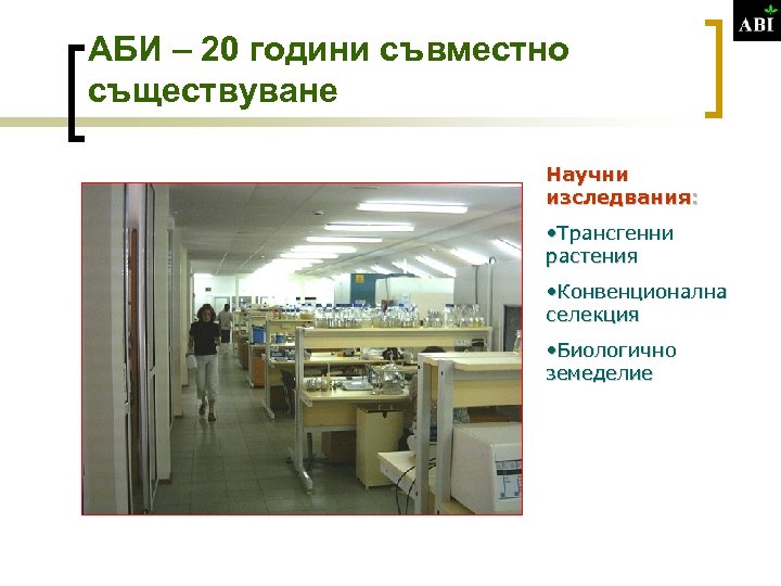 АБИ – 20 години съвместно съществуване Научни изследвания: • Трансгенни растения • Конвенционална селекция • Биологично земеделие