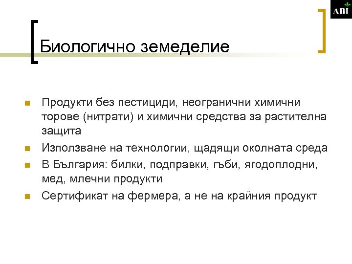 Биологично земеделие n n Продукти без пестициди, неогранични химични торове (нитрати) и химични средства за растителна защита Използване на технологии, щадящи околната среда В България: билки, подправки, гъби, ягодоплодни, мед, млечни продукти Сертификат на фермера, а не на крайния продукт