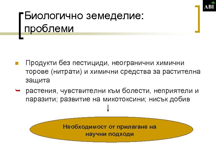 Биологично земеделие: проблеми Продукти без пестициди, неогранични химични торове (нитрати) и химични средства за растителна защита Ê растения, чувствителни към болести, неприятели и паразити; развитие на микотоксини; нисък добив n Необходимост от прилагане на научни подходи