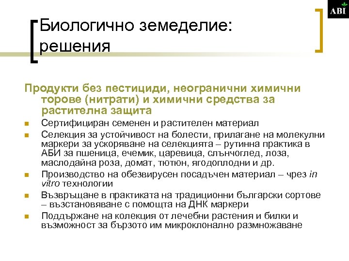 Биологично земеделие: решения Продукти без пестициди, неогранични химични торове (нитрати) и химични средства за растителна защита n n n Сертифициран семенен и растителен материал Селекция за устойчивост на болести, прилагане на молекулни маркери за ускоряване на селекцията – рутинна практика в АБИ за пшеница, ечемик, царевица, слънчоглед, лоза, маслодайна роза, домат, тютюн, ягодоплодни и др. Производство на обезвирусен посадъчен материал – чрез in vitro технологии Възвръщане в практиката на традиционни български сортове – възстановяване с помощта на ДНК маркери Поддържане на колекция от лечебни растения и билки и възможност за бързото им микроклонално размножаване