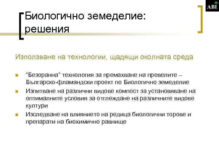 Биологично земеделие: решения Използване на технологии, щадящи околната среда n n n “Безоранна” технология за премахване на превелите – Българско-фламандски проект по Биологично земеделие Изпитване на различни видове компост за установяване на оптималните условия за отглеждане на различните видове култури Изследване на влиянието на редица биологични торове и препарати на биохимично равнище
