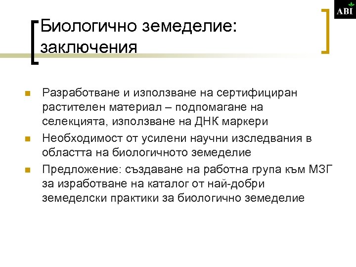 Биологично земеделие: заключения n n n Разработване и използване на сертифициран растителен материал – подпомагане на селекцията, използване на ДНК маркери Необходимост от усилени научни изследвания в областта на биологичното земеделие Предложение: създаване на работна група към МЗГ за изработване на каталог от най-добри земеделски практики за биологично земеделие