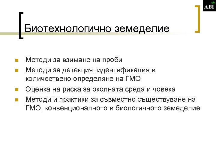 Биотехнологично земеделие n n Методи за взимане на проби Методи за детекция, идентификация и количествено определяне на ГМО Оценка на риска за околната среда и човека Методи и практики за съвместно съществуване на ГМО, конвенционалното и биологичното земеделие