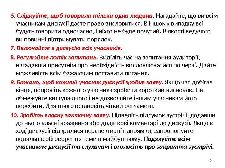 1. Введення. Подякуйте всім присутнім за згоду взяти участь у даній зустрічі і роз’ясніть її мету. Познайомте присутніх. Поясніть правила етикету даного заходу і як повинні задаватися питання і даватися відповіді на них. Уточніть обмеження, регламент і інші специфічні вимоги, пропоновані до учасників дискусії. 2. Поставте початкове питання або тему. Активізуйте діяльність учасників. Попросіть одного або всіх учасників висловитися з даного приводу. 3. Слідкуйте за дискусією. Добре мати конспект тем або точок зору, які необхідно розглянути, і постарайтеся зробити так, щоб всі вони були освітлені. 4. Підтримуйте дисципліну під час дискусії. Напруженість, як правило, виникає з приводу суперечливих питань. Дійте як посередник, якщо виникають конфлікти. Надавайте рівний час прихильникам протилежних точок зору, однак якщо дискусія виявляється безплідною, перейдіть до наступного питання, залишивши суперечливі моменти для обговорення в більш вузькому колі або під час наступних дискусій. 5. Надайте динамічність дискусії. Слідкуйте за ритмом обговорення, щоб можна було розглянути всі питання за даний час.
