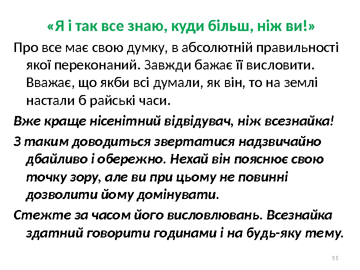 «Я і так все знаю, куди більш, ніж ви!» Про все має свою думку, в абсолютній правильності якої переконаний. Завжди бажає її висловити. Вважає, що якби всі думали, як він, то на землі настали б райські часи. Вже краще нісенітний відвідувач, ніж всезнайка! З таким доводиться звертатися надзвичайно дбайливо і обережно. Нехай він пояснює свою точку зору, але ви при цьому не повинні дозволити йому домінувати. Стежте за часом його висловлювань. Всезнайка здатний говорити годинами і на будь-яку тему.