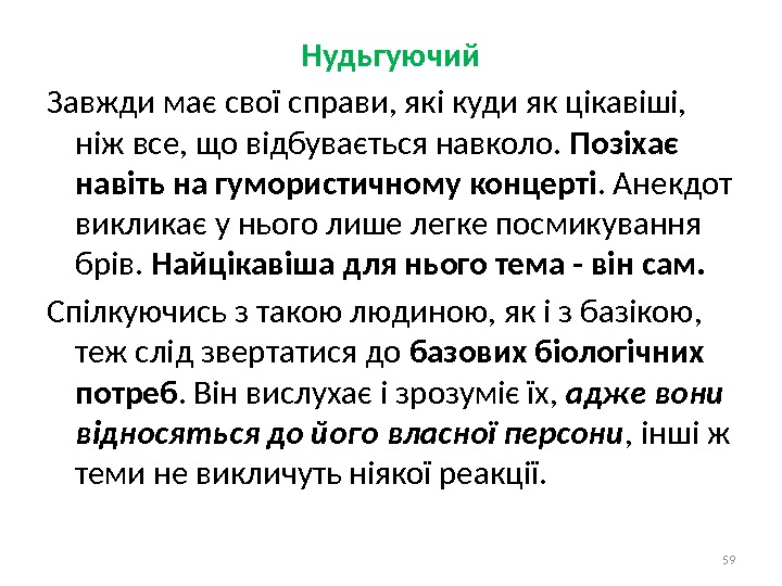 Нудьгуючий Завжди має свої справи, які куди як цікавіші, ніж все, що відбувається навколо. Позіхає навіть на гумористичному концерті. Анекдот викликає у нього лише легке посмикування брів. Найцікавіша для нього тема — він сам. Спілкуючись з такою людиною, як і з базікою, теж слід звертатися до базових біологічних потреб. Він вислухає і зрозуміє їх, адже вони відносяться до його власної персони , інші ж теми не викличуть ніякої реакції.