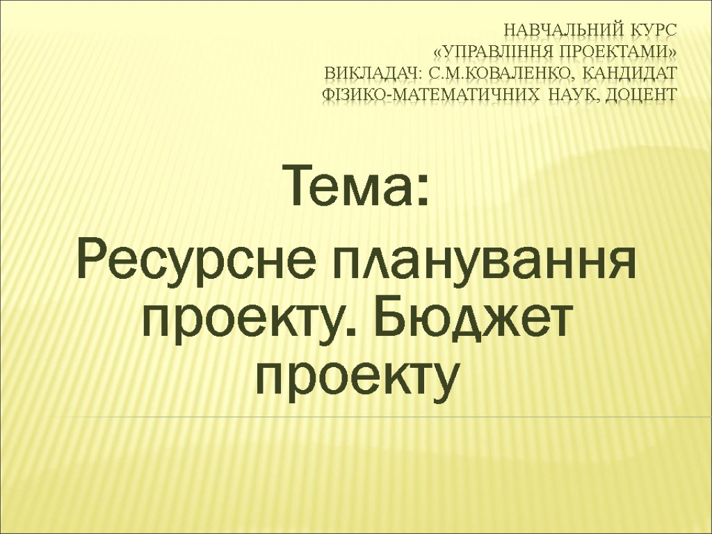 Навчальний курс «УПРАВЛІННЯ ПРОЕКТАМИ» Викладач: С.М.Коваленко, кандидат фізико-математичних наук, доцент Тема: Ресурсне планування проекту. Бюджет проекту
