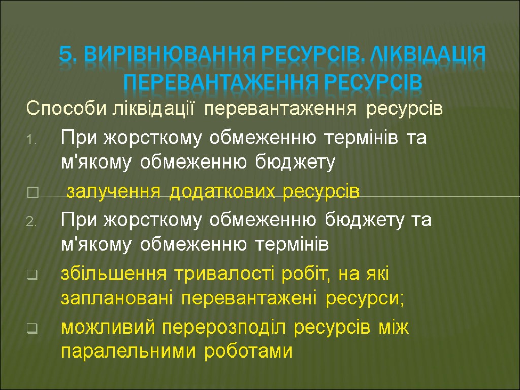 5. ВИРІВНЮВАННЯ РЕСУРСІВ. ЛІКВІДАЦІЯ ПЕРЕВАНТАЖЕННЯ РЕСУРСІВ Способи ліквідації перевантаження ресурсів При жорсткому обмеженню термінів та м'якому обмеженню бюджету залучення додаткових ресурсів При жорсткому обмеженню бюджету та м'якому обмеженню термінів збільшення тривалості робіт, на які заплановані перевантажені ресурси; можливий перерозподіл ресурсів між паралельними роботами