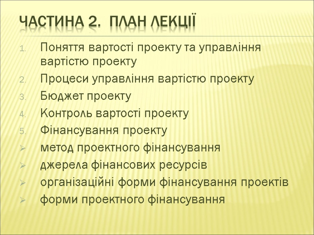 Частина 2. План лекції Поняття вартості проекту та управління вартістю проекту Процеси управління вартістю проекту Бюджет проекту Контроль вартості проекту Фінансування проекту метод проектного фінансування джерела фінансових ресурсів організаційні форми фінансування проектів форми проектного фінансування