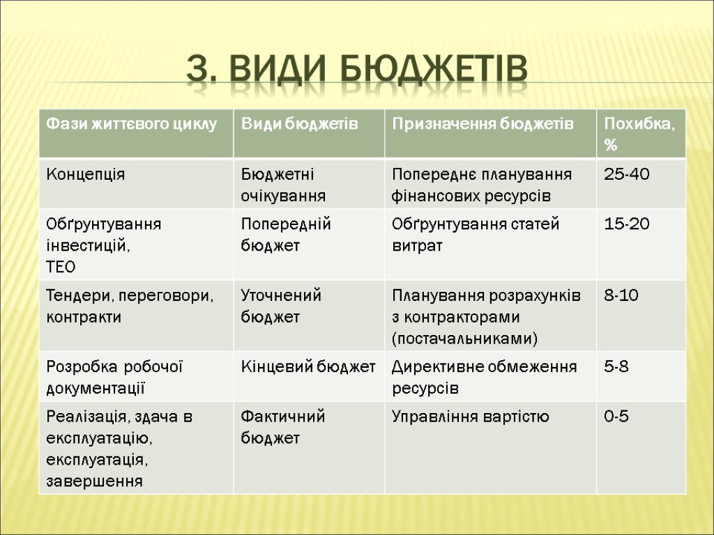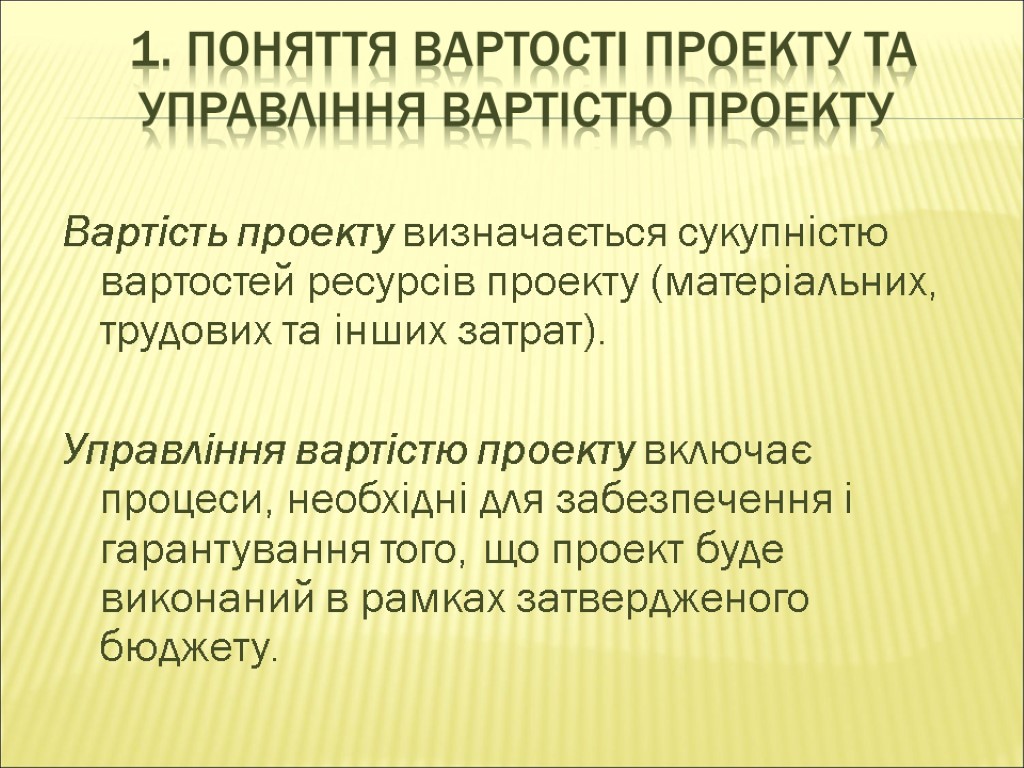 1. Поняття вартості проекту та управління вартістю проекту Вартість проекту визначається сукупністю вартостей ресурсів проекту (матеріальних, трудових та інших затрат). Управління вартістю проекту включає процеси, необхідні для забезпечення і гарантування того, що проект буде виконаний в рамках затвердженого бюджету.