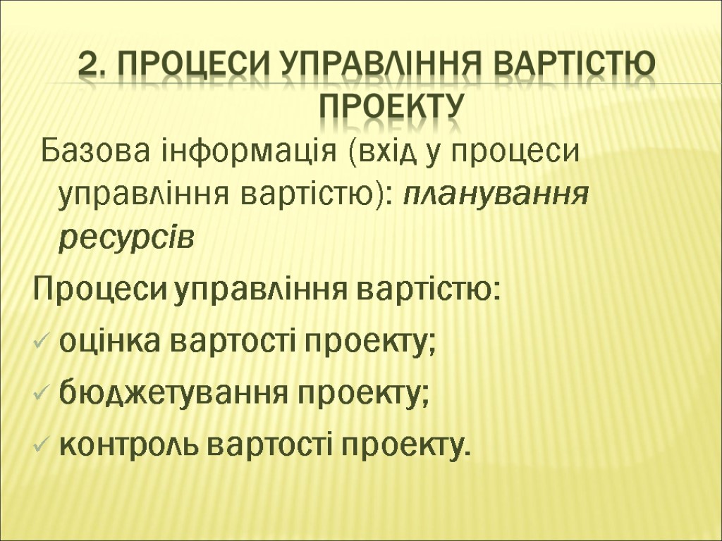 2. Процеси управління вартістю проекту Базова інформація (вхід у процеси управління вартістю): планування ресурсів Процеси управління вартістю: оцінка вартості проекту; бюджетування проекту; контроль вартості проекту.