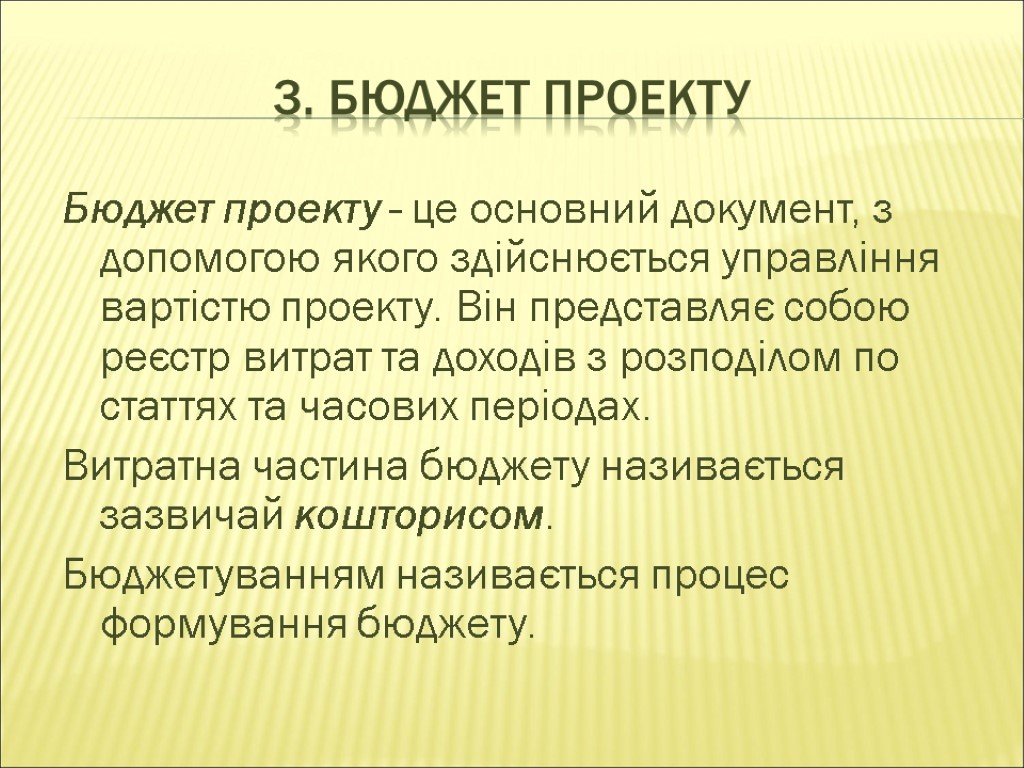 3. Бюджет проекту Бюджет проекту - це основний документ, з допомогою якого здійснюється управління вартістю проекту. Він представляє собою реєстр витрат та доходів з розподілом по статтях та часових періодах. Витратна частина бюджету називається зазвичай кошторисом. Бюджетуванням називається процес формування бюджету.