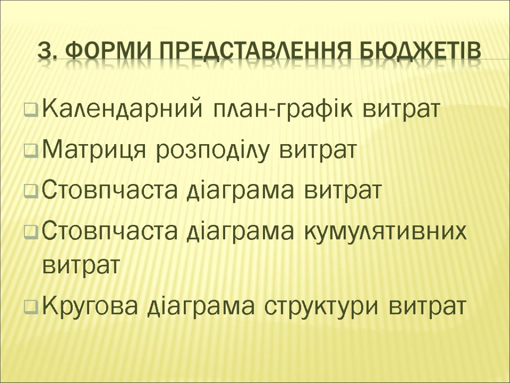 3. Форми представлення бюджетів Календарний план-графік витрат Матриця розподілу витрат Стовпчаста діаграма витрат Стовпчаста діаграма кумулятивних витрат Кругова діаграма структури витрат