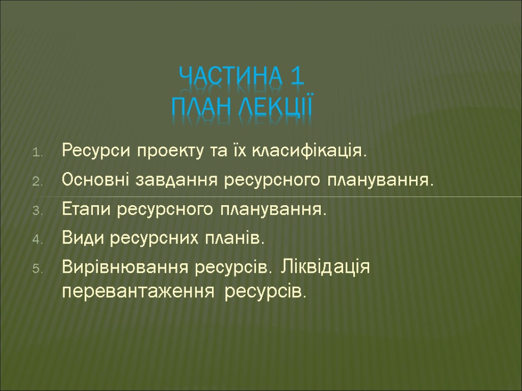 Частина 1 План лекції Ресурси проекту та їх класифікація. Основні завдання ресурсного планування. Етапи ресурсного планування. Види ресурсних планів. Вирівнювання ресурсів. Ліквідація перевантаження ресурсів.