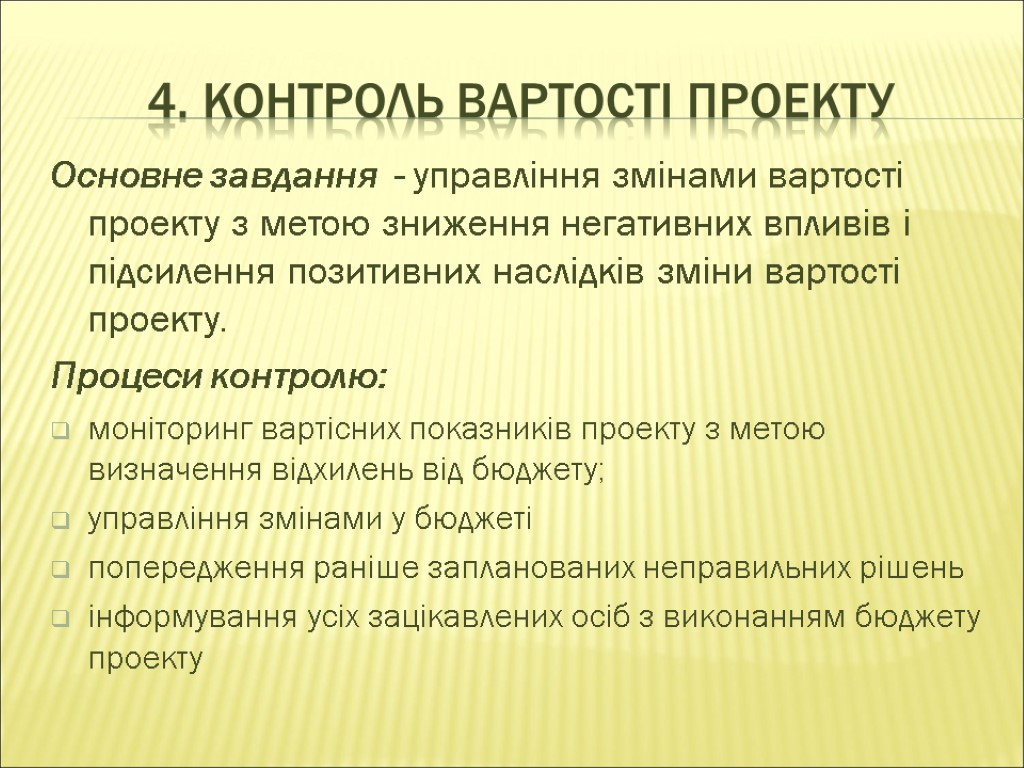 4. Контроль вартості проекту Основне завдання - управління змінами вартості проекту з метою зниження негативних впливів і підсилення позитивних наслідків зміни вартості проекту. Процеси контролю: моніторинг вартісних показників проекту з метою визначення відхилень від бюджету; управління змінами у бюджеті попередження раніше запланованих неправильних рішень інформування усіх зацікавлених осіб з виконанням бюджету проекту