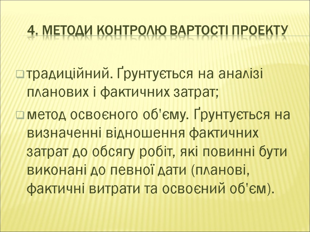 4. Методи Контролю вартості проекту традиційний. Ґрунтується на аналізі планових і фактичних затрат; метод освоєного об'єму. Ґрунтується на визначенні відношення фактичних затрат до обсягу робіт, які повинні бути виконані до певної дати (планові, фактичні витрати та освоєний об'єм).