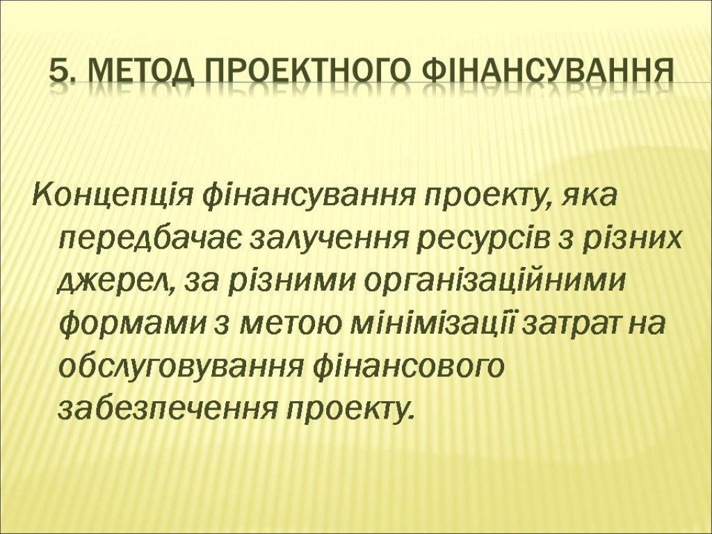 5. метод проектного фінансування Концепція фінансування проекту, яка передбачає залучення ресурсів з різних джерел, за різними організаційними формами з метою мінімізації затрат на обслуговування фінансового забезпечення проекту.