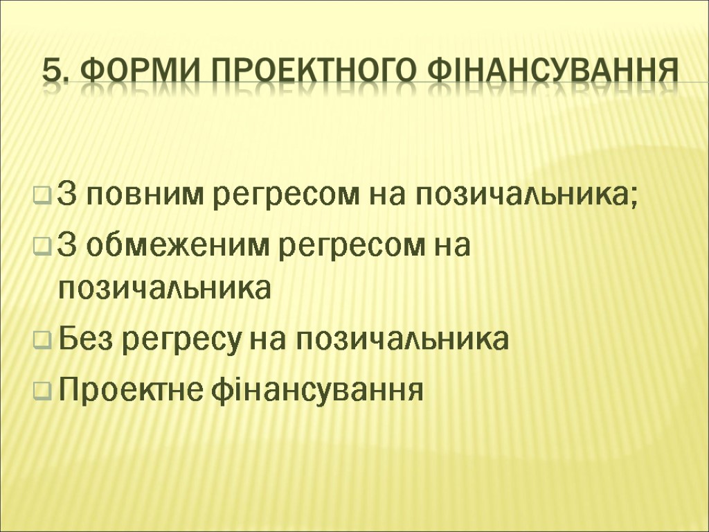5. форми проектного фінансування З повним регресом на позичальника; З обмеженим регресом на позичальника Без регресу на позичальника Проектне фінансування