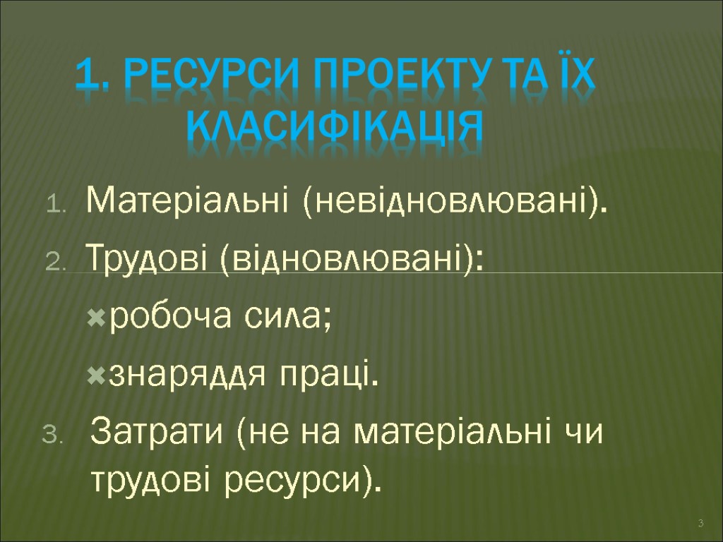1. Ресурси проекту та їх класифікація Матеріальні (невідновлювані). Трудові (відновлювані): робоча сила; знаряддя праці. Затрати (не на матеріальні чи трудові ресурси). 3