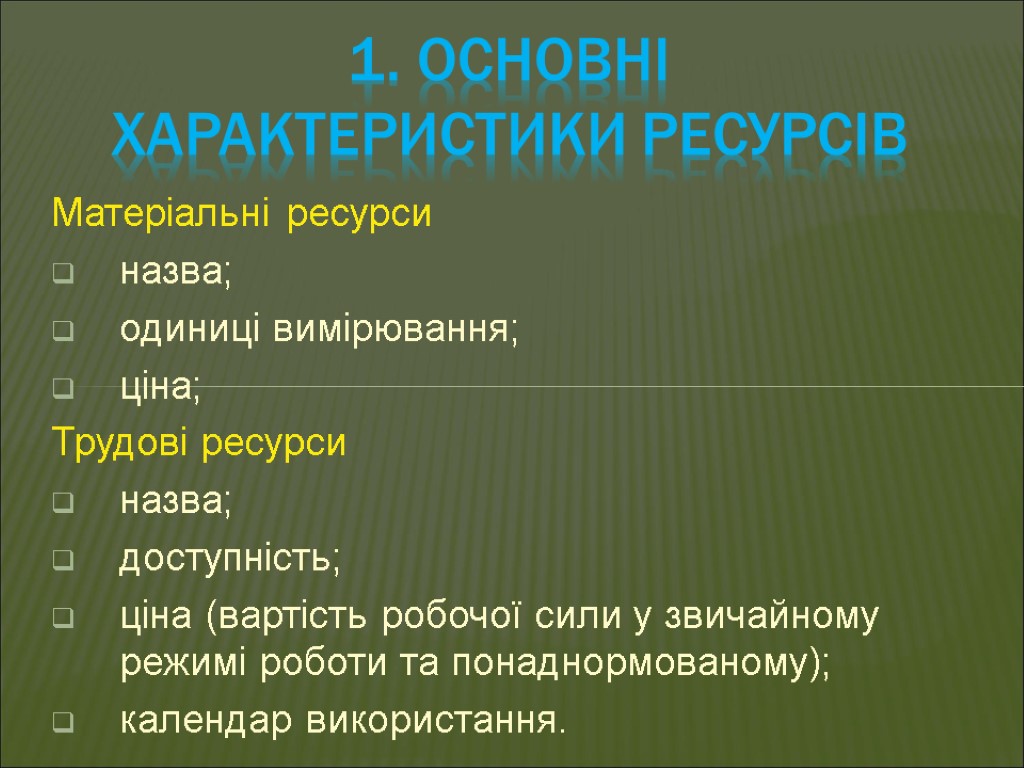 1. Основні ХАРАКТЕРИСТИКИ ресурсів Матеріальні ресурси назва; одиниці вимірювання; ціна; Трудові ресурси назва; доступність; ціна (вартість робочої сили у звичайному режимі роботи та понаднормованому); календар використання.
