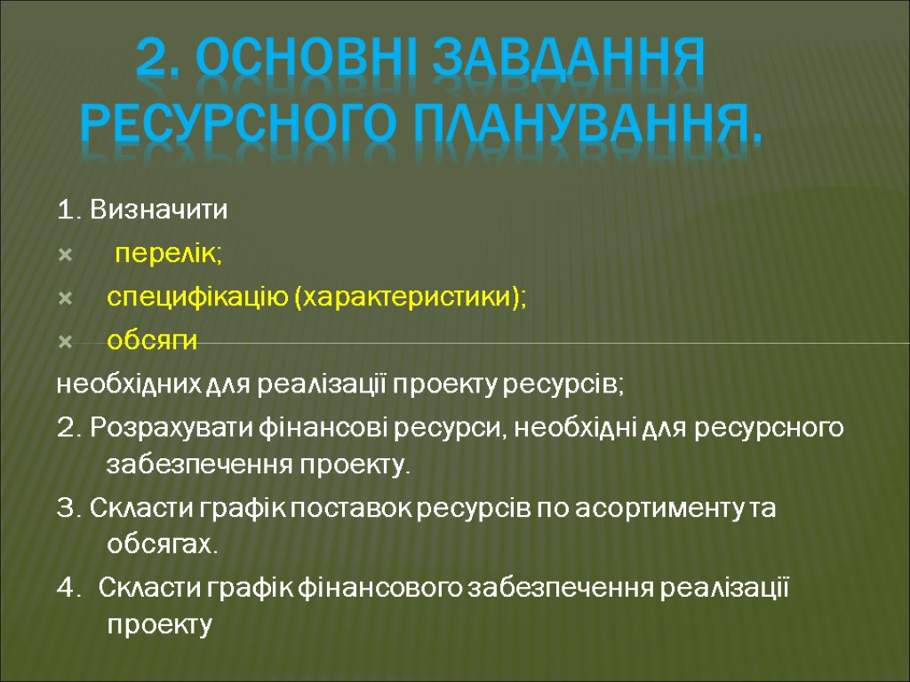 2. Основні завдання ресурсного планування. 1. Визначити перелік; специфікацію (характеристики); обсяги необхідних для реалізації проекту ресурсів; 2. Розрахувати фінансові ресурси, необхідні для ресурсного забезпечення проекту. 3. Скласти графік поставок ресурсів по асортименту та обсягах. 4. Скласти графік фінансового забезпечення реалізації проекту