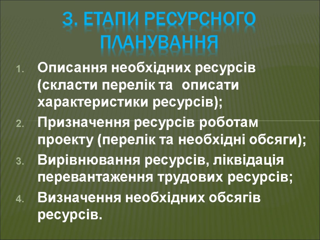 3. ЕТАПИ ресурсного планування Описання необхідних ресурсів (скласти перелік та описати характеристики ресурсів); Призначення ресурсів роботам проекту (перелік та необхідні обсяги); Вирівнювання ресурсів, ліквідація перевантаження трудових ресурсів; Визначення необхідних обсягів ресурсів.