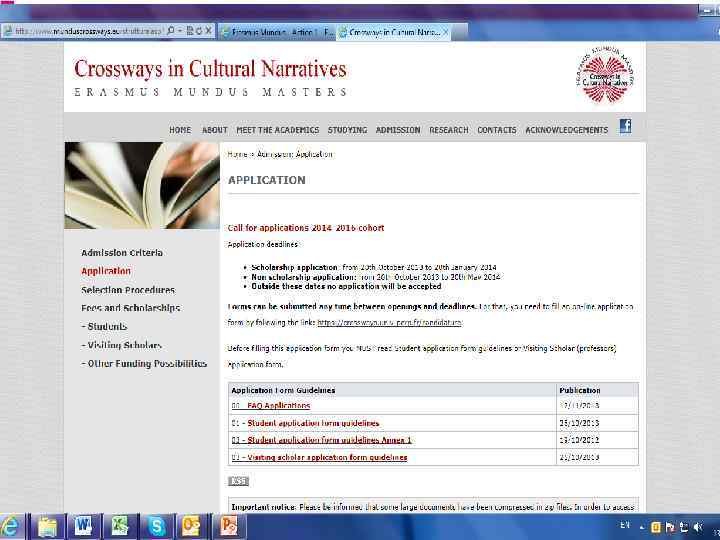 • Master Programme Crossways in Cultural Narratives • Тривалість програми: 2 роки, чотири семестри • Тип диплому: multiple degree (багатосторонній диплом) • Схема мобільності: Sem 1 – Uni A; Sem 2 – Uni B; Sem 3 – Uni B; Sem 4 – Uni C. Кандидати мають право розробити свою схему мобільності • Хто може подаватися на програму? Кандидати, які мають рівень бакалавра з мистецтва/ культури (Arts), мов (Languages) чи соціальних наук (Social Sciences) • Вимагається знання двох з таких європейських мов: English, French, Italian, Portuguese, Polish • Кінцевий термін подання заявок на отримання стипендії: 20 січня 2014 року