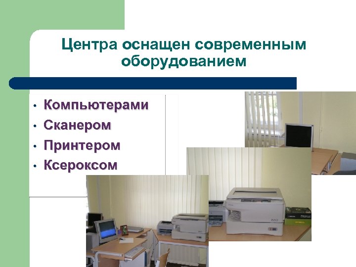 Центра оснащен современным оборудованием • • Компьютерами Сканером Принтером Ксероксом