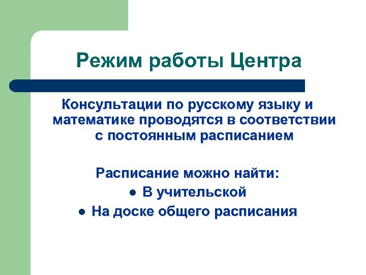 Режим работы Центра Консультации по русскому языку и математике проводятся в соответствии с постоянным расписанием Расписание можно найти: В учительской На доске общего расписания