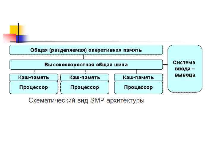 SMP архитектура (symmetric multiprocessing) - cимметричная многопроцессорная архитектура. Главной особенностью систем с архитектурой SMP является наличие общей физической памяти, разделяемой всеми процессорами. Схематический вид SMP-архитектуры