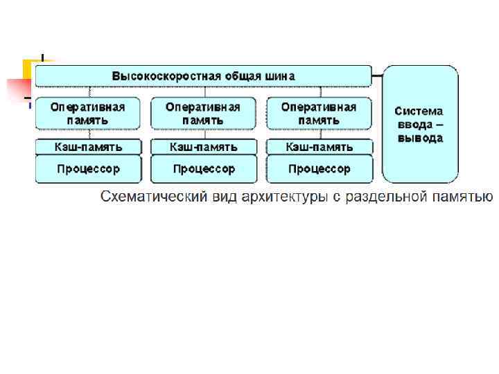 Главное преимущество Главным преимуществом систем с раздельной памятью является хорошая масштабируемость: в отличие от SMP-систем в машинах с раздельной памятью каждый процессор имеет доступ только к своей локальной памяти, в связи с чем не возникает необходимости в потактовой синхронизации процессоров. Практически все рекорды по производительности на сегодняшний день устанавливаются на машинах именно такой архитектуры, состоящих из нескольких тысяч процессоров (ASCI Red, ASCI Blue Pacific).