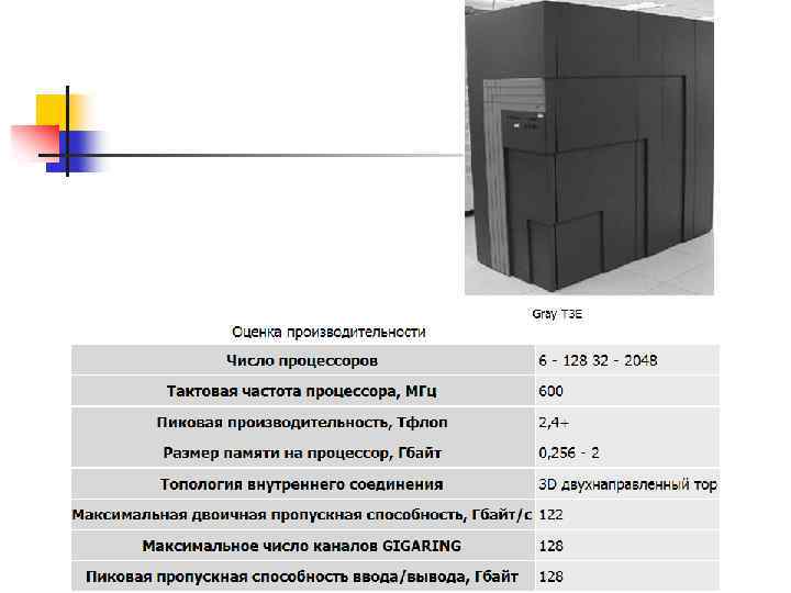 n n Системами с раздельной памятью являются суперкомпьютеры МВС-1000, IBM RS/6000 SP, SGI/CRAY T 3 E, системы ASCI, Hitachi SR 8000, системы Parsytec. Машины последней серии CRAY T 3 E от SGI, основанные на базе процессоров Dec Alpha 21164 с пиковой производительностью 1200 Мфлопс/с (CRAY T 3 E-1200), способны масштабироваться до 2048 процессоров.