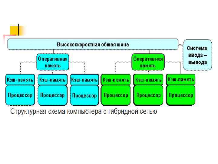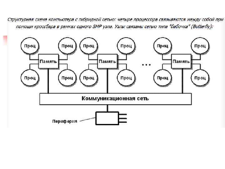 Проблемы выполнения сети связи процессоров в кластерной системе. n Архитектура кластерной системы (способ соединения процессоров друг с другом) в большей степени определяет ее производительность, чем тип используемых в ней процессоров. Критическим параметром, влияющим на величину производительности такой системы, является расстояние между процессорами. Так, соединив вместе 10 персональных компьютеров, мы получим систему для проведения высокопроизводительных вычислений, проблема, однако, будет состоять в нахождении наиболее эффективного способа соединения стандартных средств друг с другом, поскольку при увеличении производительности каждого процессора в 10 раз производительность системы в целом в 10 раз не увеличится.