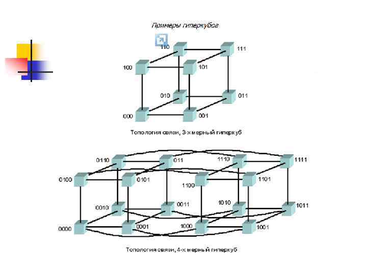 n n При таком типе соединения максимальное расстояние между процессорами окажется равным 6 (количество связей между процессорами, отделяющих самый ближний процессор от самого дальнего). Теория же показывает, что если в системе максимальное расстояние между процессорами больше 4, то такая система не может работать эффективно. Поэтому, при соединении 16 процессоров друг с другом плоская схема является не эффективной. Для получения более компактной конфигурации необходимо решить задачу о нахождении фигуры, имеющей максимальный объем при минимальной площади поверхности. В трехмерном пространстве таким свойством обладает шар. Но поскольку нам необходимо построить узловую систему, то вместо шара приходится использовать куб (если число процессоров равно 8) или гиперкуб, если число процессоров больше 8. Размерность гиперкуба будет определяться в зависимости от числа процессоров, которые необходимо соединить. Так, для соединения 16 процессоров потребуется 4 -х мерный гиперкуб. Для его построения следует взять обычный 3 -х мерный куб, сдвинуть в еще одном направлении и, соединив вершины, получить гиперкуб размером 4.